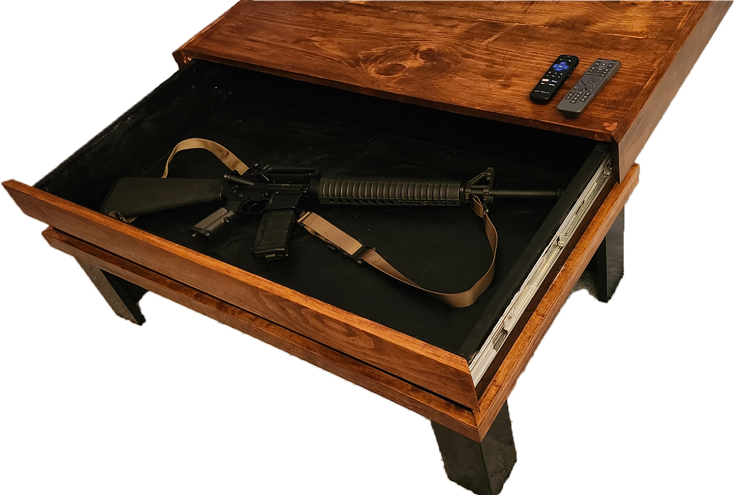 Company, we believe that home defense should be integrated, not intrusive. That's why we specialize in handcrafting stunning coffee tables that provide a masterfully concealed and rapidly accessible storage solution for your firearms. Each table is a work of American craftsmanship, designed to be a beautiful centerpiece in your living space while offering the peace of mind that comes with knowing your protection is hidden in plain sight. Explore our collection and redefine your approach to home security.